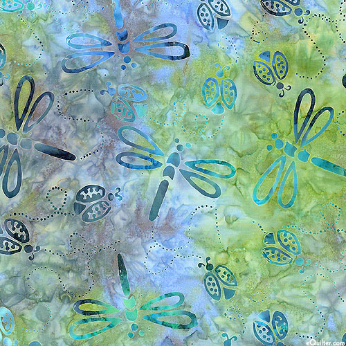 Dragonflies and ladybugs that flutter to and fro are depicted in vivid hues within mottled batik textures. Batik, larger dragonflies are about 3-3/4", 'Dragonflies', from the 'Tonga Juniper' collection by Timeless Treasures.
