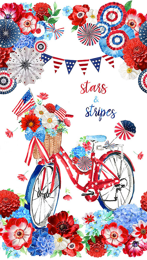 In this panel, a patriotic parade of banners, flowers, and bikes are elegantly decorated in patterns of the American flag. Digitally printed, 24" panel, 'Patriotic Floral Panel' from the 'Stars & Stripes' collection by Timeless Treasures.