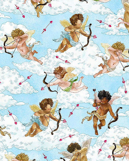 Baby cupids shoot heart-tipped arrows from the heavens in this romantic Valentines-themed design. Digitally printed, larger cupids are about 3-1/4", from the 'Love Struck' collection by Mar Auslander for Quilting Treasures.