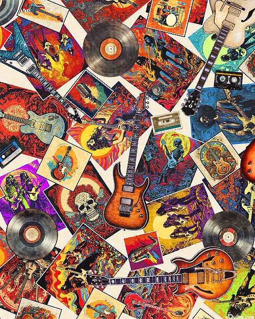 Collector's items for the music fan are scattered across the design including records, album covers, band posters, electric guitars, and cassette tapes. Digitally printed, larger guitars are about 6-1/2", from the 'Rock 'N Roll Fantasy' collection by Dan Morris for Quilting Treasures.