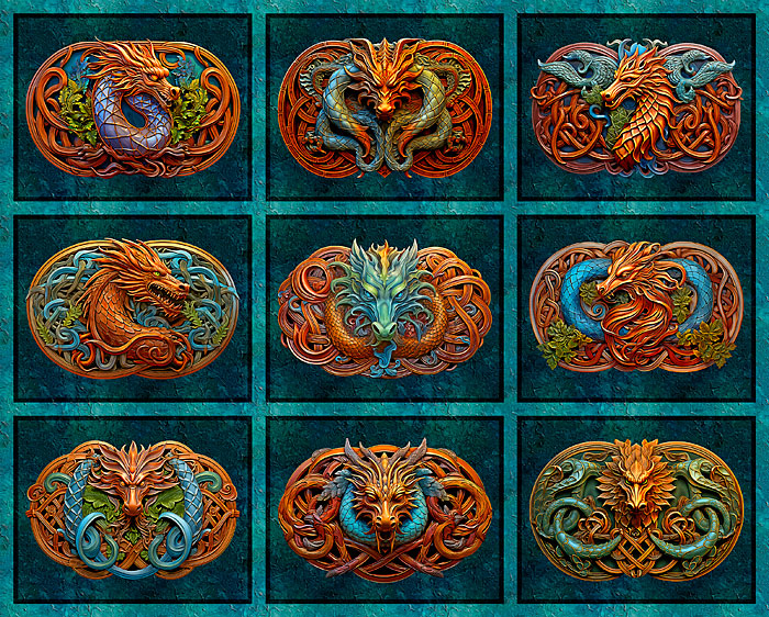 Colorful tablets engraved with imagery of wicked serpent beasts are surrounded by intricate Celtic knots that lend an ancient air to this enchanting panel. Digitally printed, 35" panel, 'Celtic Dragon Panel' by the Rubin Design Studio, designed exclusively for eQuilter.