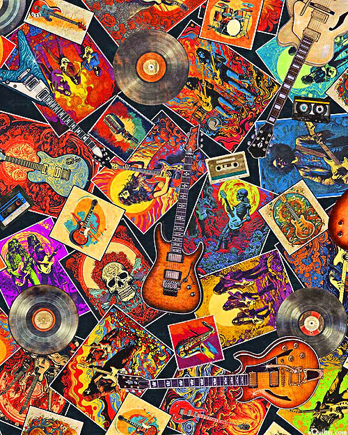 Collector's items for the music fan are scattered across the design including records, album covers, band posters, electric guitars, and cassette tapes. Digitally printed, larger guitars are about 6-1/2", from the 'Rock 'N Roll Fantasy' collection by Dan Morris for Quilting Treasures.