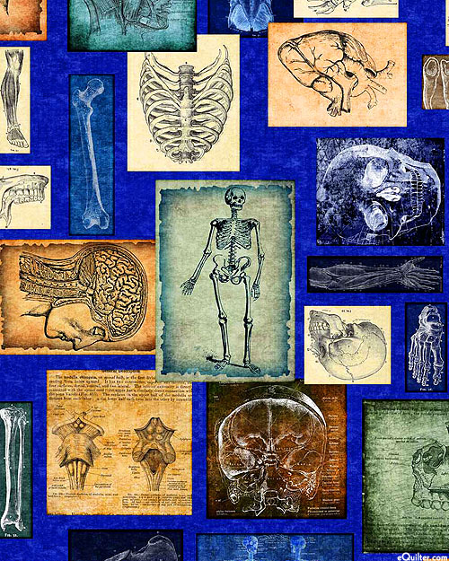 Photographs and drawings of various organs and bones that a detective might use for crime analysis are scattered across the design. Digitally printed, larger photos are about 6", from the 'True Detective' collection by Dan Morris for Quilting Treasures.