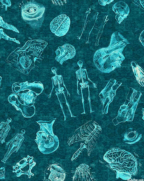 Photographs and drawings of various organs and bones that a detective might use for crime analysis are scattered across the design. Digitally printed, larger skeletons are about 3-1/4", from the 'True Detective' collection by Dan Morris for Quilting Treasures.
