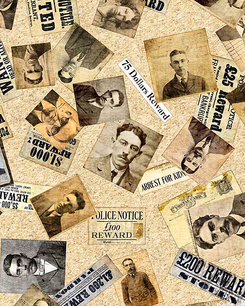 Vintage wanted posters showing old criminal mugshots and the cash reward for turning them in are scattered across the design. Digitally printed, larger photos are about 2", from the 'True Detective' collection by Dan Morris for Quilting Treasures.