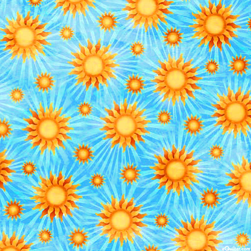 Bright suns blooming like flowers bring a summery vibrance to this radiant design. Digitally printed, larger suns are about 1-1/2", from the 'Rise Up' collection by Cindy Sepp for Quilting Treasures.