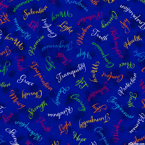 Wholesome words of wisdom and bravery are written in cursive against a mottled background of cloudy hues. Digitally printed, taller text is about 3/4", from the 'Rise Up' collection by Cindy Sepp for Quilting Treasures.
