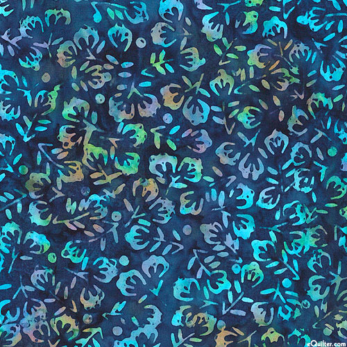 Lush and leafy flower buds are depicted in vivid hues within mottled batik textures. Batik, larger leaves are about 1/2", 'Buds' from the 'Bali Fantasy Garden' collection by Benartex Fabrics.