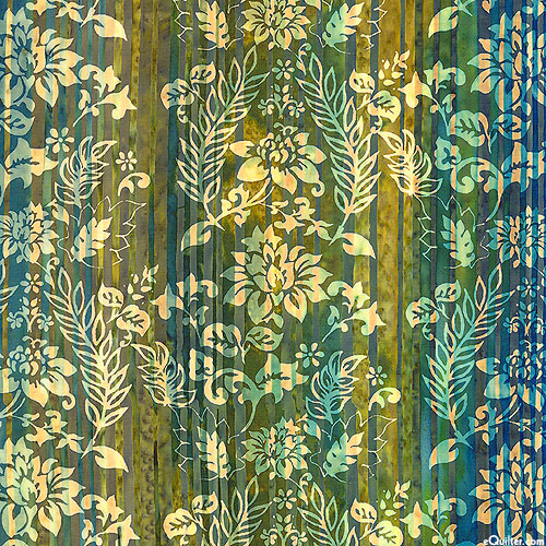 Bold blossoms flourishing against a background of striped colors are depicted in vivid hues within mottled batik textures. Batik, larger flowers are about 2", stripes run the length of the fabric, from the 'Express Yourself! - Color Bands' collection by Riley Blake Designs.
