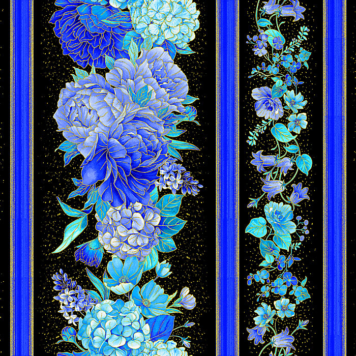 A lush landscape of flourishing flowers coalesce to create a captivating garden gala of texture and tone. Wider stripes are about 6", stripes run the length of the fabric, with gold metallic, includes four stripes from selvedge edge to selvedge edge, 'Floral Metallic 11" Stripes' from the 'Escapade' collection by Chong-A Hwang for Timeless Treasures.