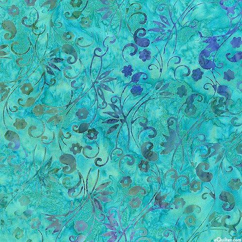 Lush florals blooming on the leafy branches of a tree are depicted in vivid hues within mottled batik textures. Batik, larger leaves are about 3/4", from the 'Chalk & Charcoal' collection by Riley Blake Designs.