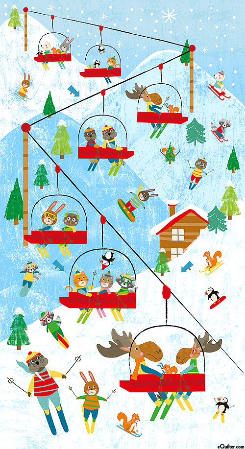 A myriad of alpine animals come together to enjoy a fun snowy day on the slopes of the ski mountain. Digitally printed, 24" panel, 'Ski Lift Panel' from the 'Snow Fun' collection by Liza Lewis for Clothworks.