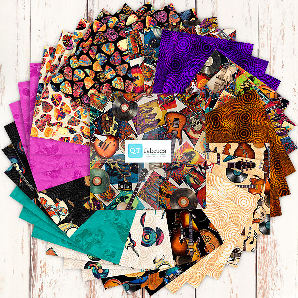 Rock out and play the blues with this vibrant pre-cut featuring imagery of musical instruments, guitar picks, vinyl albums, and more! 'Rock 'N Roll Fantasy' ten-square pack by Dan Morris for Quilting Treasures, pack includes forty-two 10" x 10" squares.