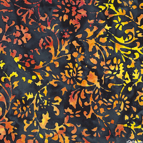 Scrolling florals flourishing in the warmth of the sun are depicted in vivid hues within mottled batik textures. Batik, larger flowers are about 1", from the 'Urban Folk' collection by Riley Blake Designs.