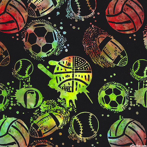 Soccer balls, volleyballs, footballs, baseballs, and basketballs are depicted in vivid hues within mottled batik textures. Batik, larger sports balls are about 2-3/4", from the 'Let's Play Ball!' collection by Riley Blake Designs.