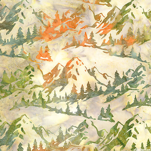 Tall peaks rising high above the treeline are depicted in vivid hues within mottled batik textures. Batik, taller mountains are about 3", from the 'Places You'll Go' collection by Riley Blake Designs.