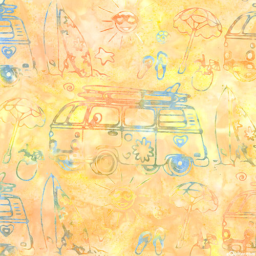 A fun mix of beach vans, surfboards, and other summery motifs are depicted in vivid hues within mottled batik textures. Batik, vehicles are about 7" from the 'Places You'll Go' collection by Riley Blake Designs.