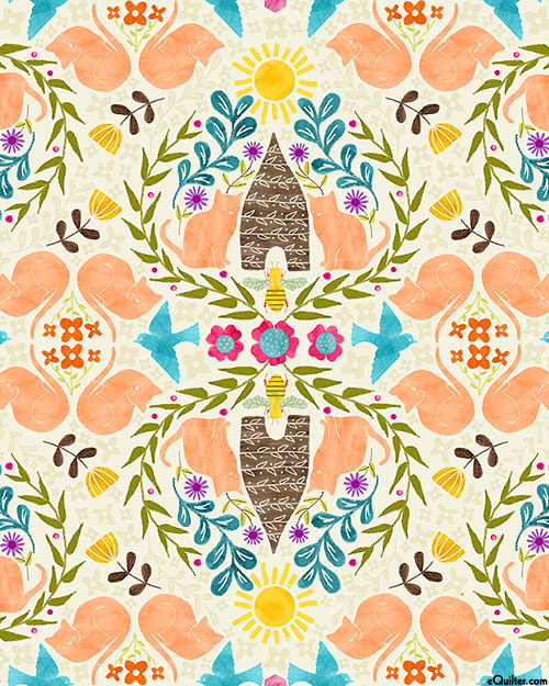 Gather together among lush florals and beehives are a curious cast of garden friends including cats, birds, and honeybees. Digitally printed, larger cats are about 1-1/2", 'Hive Mind' from the 'Curious Garden' collection by Pammie Jane for Dear Stella, a division of Timeless Treasures.