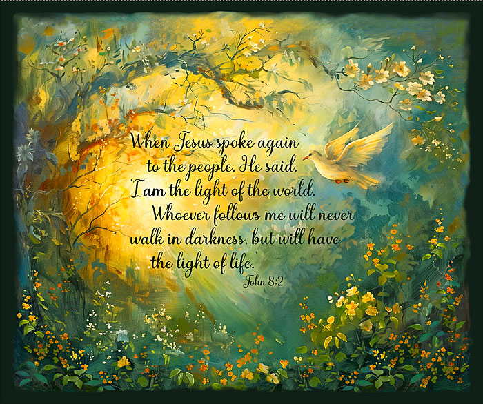 A verse from John 8:2 is written against beautiful forest scenery including lush florals and a dove flying across this picturesque panel. Digitally printed, 36" panel, from the 'Light of the World' collection by Claudia McKinney for Quilting Treasures.