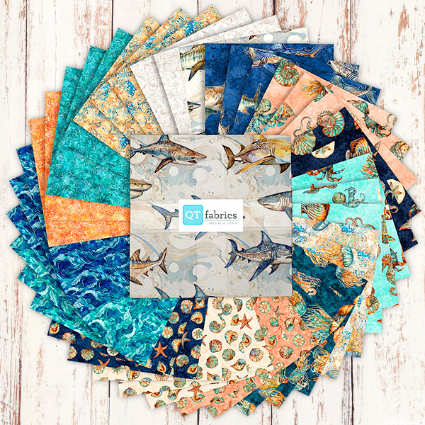 Take a glimpse beneath the waves with the enchanting marine motifs of this aquatic pre-cut. 'Atlantis' ten-square pack by Dan Morris for Quilting Treasures, pack includes forty-two 10" x 10" squares.