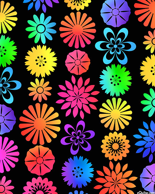 An ombre of rainbow color washes over rows of various groovy flowers, gibing his fun fabric a unique flower-power quality! Digitally printed, larger flowers are about 1-1/4", from the 'Pawsitivity' collection by Jason Yenter for In The Beginning Fabrics.