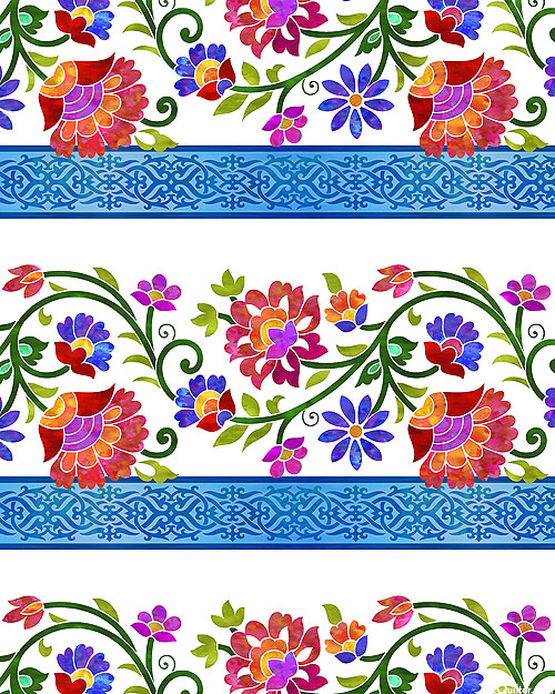 A lush landscape of flourishing florals blooms boldly between intricate stripes filled with Celtic knots. Digitally printed, wider stripes are about 8-1/2", stripes run the length of the fabric, from the 'Prism II' collection by Jason Yenter for In The Beginning Fabrics.