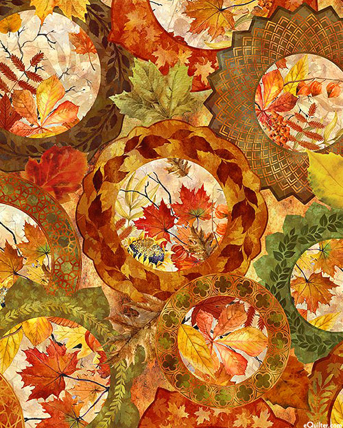 Warmly-hued Autumn leaves framed within flowery wreaths add a festive flair to this happy harvest design. Digitally printed, larger frames are about 5-1/2", from the 'Autumn Celebration' collection by Jason Yenter for In The Beginning Fabrics.