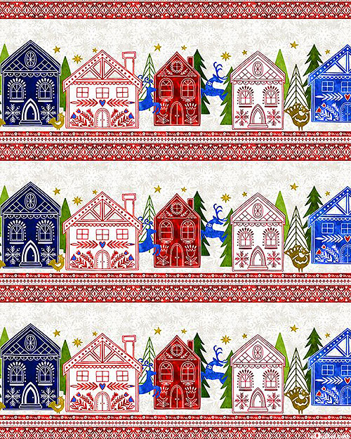 Merry reindeer prance between houses in this festive striped design. Digitally printed, wider stripes are about 6-1/2", stripes run the length of the fabric, from the 'New Snow' collection by Jason Yenter for In The Beginning Fabrics.