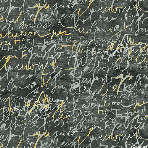 Cursive handwriting is displayed across the design in intricate and elegant detail that shows off the charming penmanship of the writer. Taller script is about 1-1/2", with gold metallic, 'Fluidity Script Large' from the 'Fluidity' collection by Marta Cortese for Benartex.