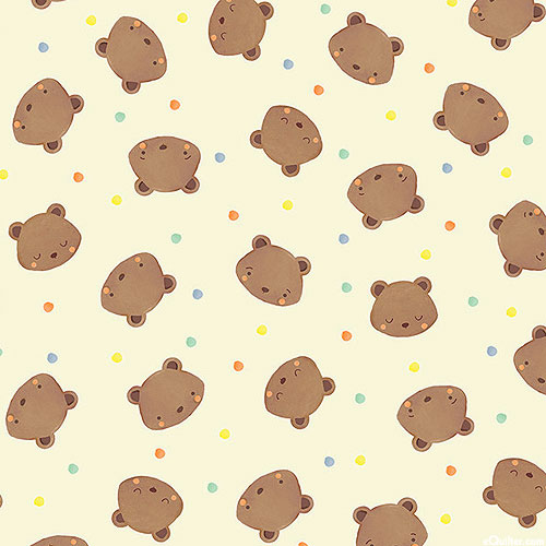 The adorable faces of baby bears wearing a variety of colorful expressions are tossed across the design with polka dots scattered in the space between. Digitally printed, larger bears are about 4-3/4", 'Tossed Bear Heads' from the 'Honey Bear' collection by Timeless Treasures.