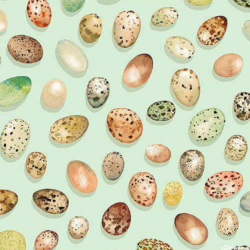 Colorful bird eggs are scattered against a solid background. Digitally printed, larger eggs are about 7/8", 'Bird Eggs' from the 'From Little Acorns' collection by Louise Nisbet for Michael Miller Fabrics.