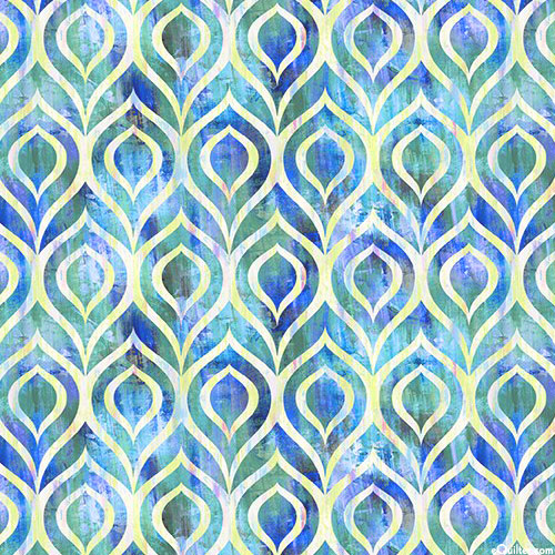 Repeating patterns reminiscent of a peacock's plumage are depicted in vivid hues within richly mottled textures. Digitally printed, taller shapes are about 2-1/2", from the 'Halcyon II' collection by Jason Yenter for In The Beginning Fabrics.