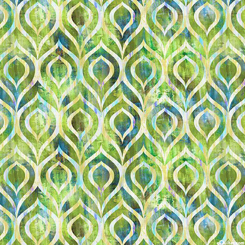 Repeating patterns reminiscent of a peacock's plumage are depicted in vivid hues within richly mottled textures. Digitally printed, taller shapes are about 2-1/2", from the 'Halcyon II' collection by Jason Yenter for In The Beginning Fabrics.