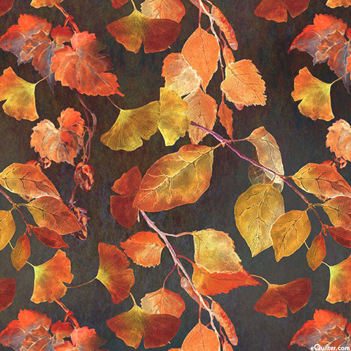 Leafy fronds one might find on the forest floor in autumn are scattered across this delightful design. Larger leaves are about 2-1/4", from the 'Reflections of Autumn 2' collection by In The Beginning Studio for In The Beginning Fabrics.