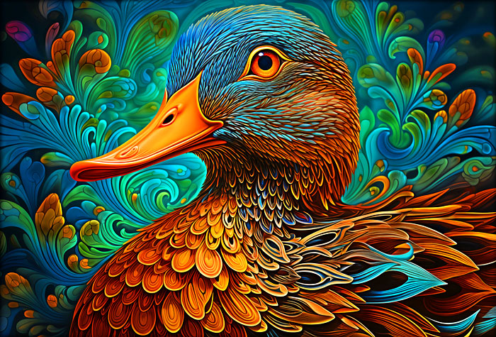 The captivating face of an intricately adorned duck emerges from delicately illustrated patterns reminiscent of those found in mandalas and zentangle designs. Digitally printed, 29" panel, 'Mysterious Duck' by the Rubin Design Studio, designed exclusively for eQuilter.