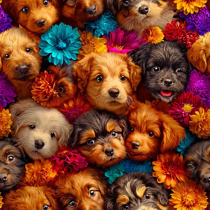 In this pet-lovers design, a cozy cast of furry friends cuddle together in a lush garden full of vibrant florals. Digitally printed, doggy faces are about 3", 'Floral Doggies 2' by the Rubin Design Studio, designed exclusively for eQuilter.