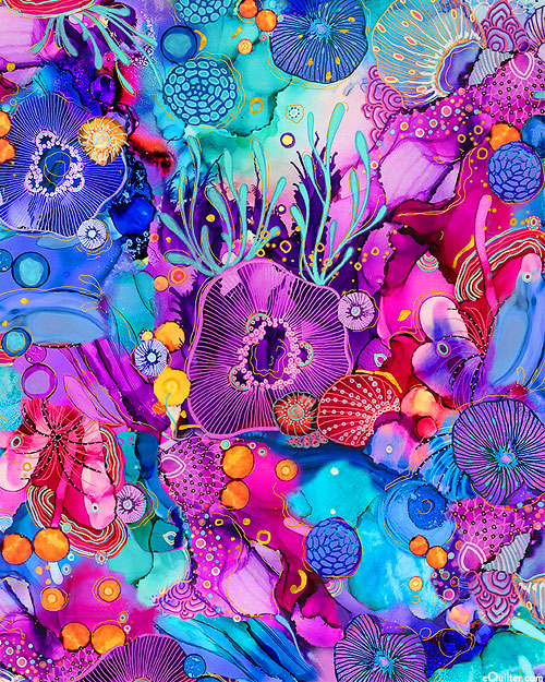 Colorful anemones and wriggling sea grasses dance together in the waters beneath the ocean. Larger shapes are about 4", from the 'Painted Sea' collection by Amy Tieman for P&B Textiles.