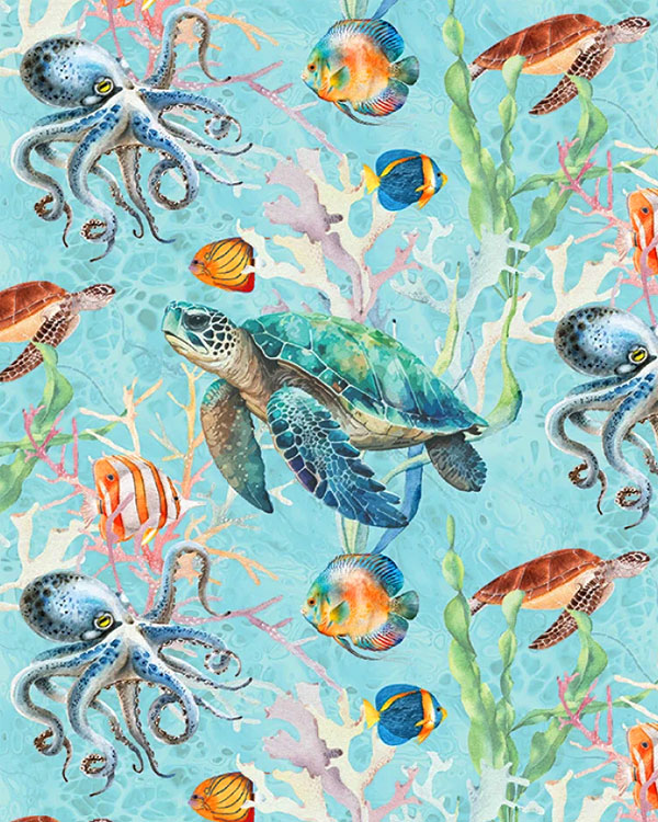 Sea turtles, octopi, and other fish are seen swimming in the ocean to create a mesmerizing masterpiece of maritime magnificence across this picturesque piece. Larger turtles are about 4", 'Under Sea World' from the 'Under The Sea' collection by Skyline Studios for Benartex Fabrics.