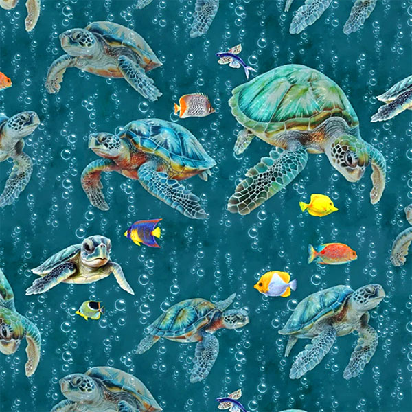 Sea turtles swimming in the ocean create a mesmerizing masterpiece of maritime magnificence across this picturesque piece. Larger turtles are about 2-3/4", 'Sea Turtle Swim' from the 'Under The Sea' collection by Skyline Studios for Benartex Fabrics.
