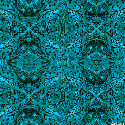 Cross-sections of a peacock's train are reflected into a kaleidoscopic cascade of color and shadow. Horizontal repeat is about 3-3/4", 'Mandalay' from the 'Affinity' collection by Danielle Duer for Benartex Fabrics.