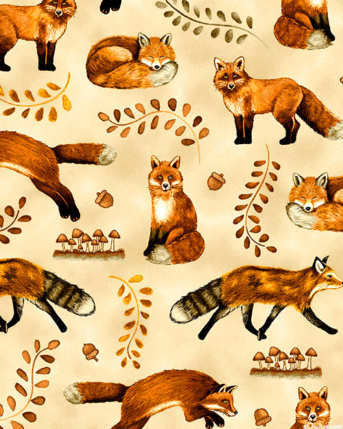 Leafy branches are scattered against a mottled background with foxes and acorns tossed in the space between. Larger foxes are about 3-1/4", from the 'Hello Pumpkin' collection by Dawn Rosengren for Henry Glass & Co.