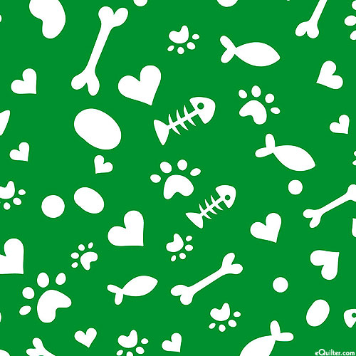 Paw prints are scattered across the design with fish bones and other shapes tossed in the space between. Larger bones are about 1-1/4", 'Cat Paw Ditsy' by David Textiles.