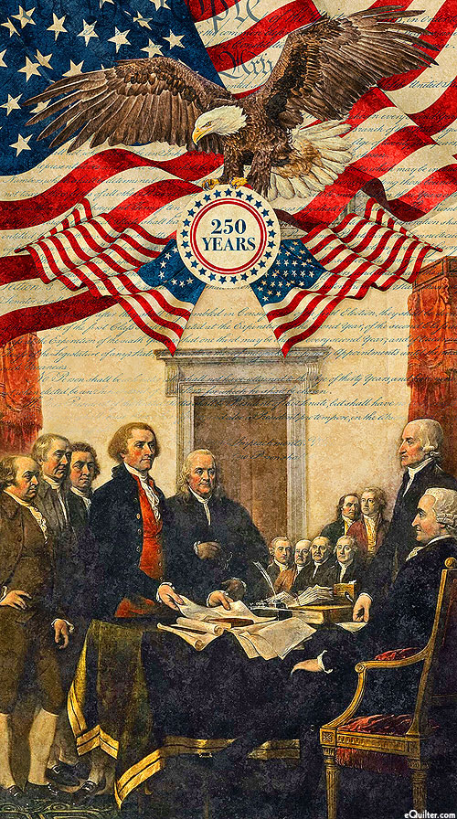 In this proudly patriotic panel, the founding fathers are seen gathered together for the moment in America's history when the Constitution was created. Digitally printed, 24" panel, from the 'America 250 - Stonehenge' collection by Linda Ludovico for Northcott Fabrics.