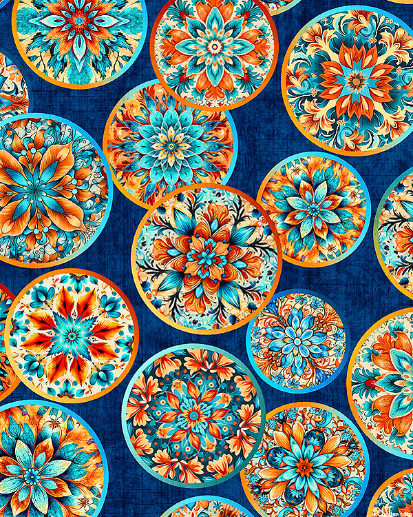 Floral mandalas come to life across a set of round medallions scattered against a background of vividly mottled hues. Digitally printed, larger medallions are about 3", from the 'Oasis' collection by Dan Morris for Quilting Treasures.