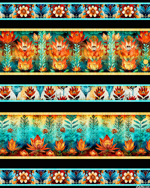 Floral patterns one might see on a fine wallpaper are layered between the stripes of this elegant design. Digitally printed, wider stripes are about 3", stripes run the length of the fabric, from the 'Oasis' collection by Dan Morris for Quilting Treasures.