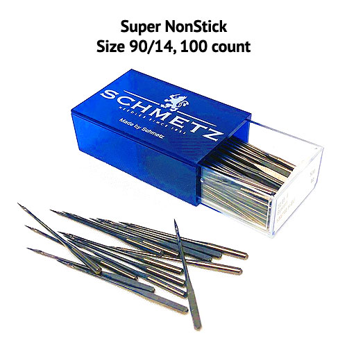 Tired of gumming up needles with stubborn adhesives? Complaining about missed stitches and thread breakage caused by adhesives? Users of adhesive stabilizers, temporary adhesives, or self-adhesive hook and loop tapes can now rejoice! Slippery surface of Super Nonstick Needles ensures less "goo" sticks to the needle! Super NonStick Sewing Machine Needles, sold in a box of 100, size 90/14 from Schmetz.