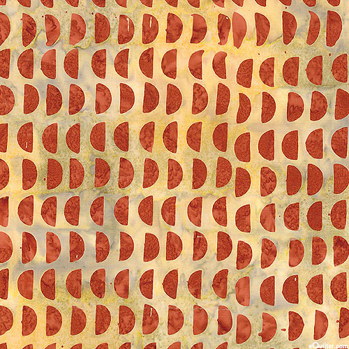 Semicircle shapes neatly arranged into rows are depicted in vivid hues within mottled batik textures. Batik, larger shapes are about 3/4", from the 'Organics' collection by Banyan Batiks for Northcott Fabrics.