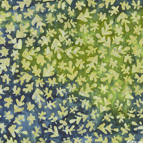 A lush scatter of leafy fronds are depicted in vivid hues within mottled batik textures. Batik, larger leaves are about 1", from the 'Organics' collection by Banyan Batiks for Northcott Fabrics.