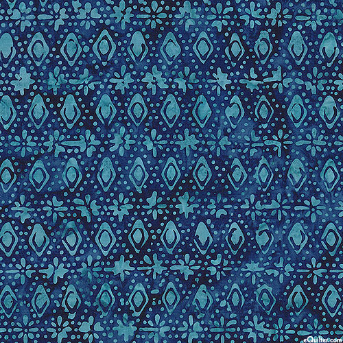 Repeating tiles of alternating diamond and floral shapes are depicted in vivid hues within mottled batik textures. Batik, larger diamonds are about 3/4", from the 'Tile Fusion' collection by Banyan Batiks for Northcott Fabrics.
