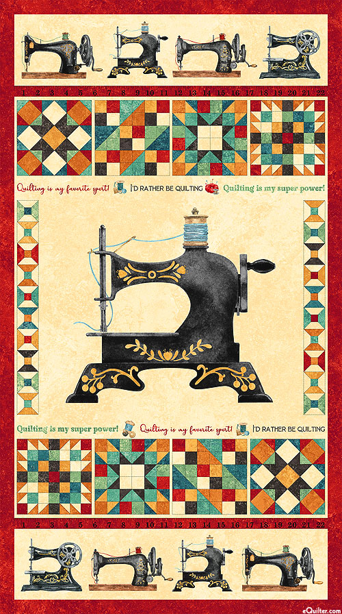 Panel blocks contain imagery of various vintage sewing machines pictured between geometric quilt patterns and inspirational quilting slogans. Digitally printed, 24" panel, from the 'Stitchin' - Stonehenge' collection by Deborah Edwards for Northcott Fabrics.